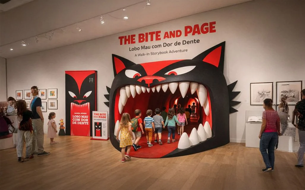 A large-scale “book cover” entrance introduces the story world and establishes the exhibition as a spatial reading experience.The Mouth